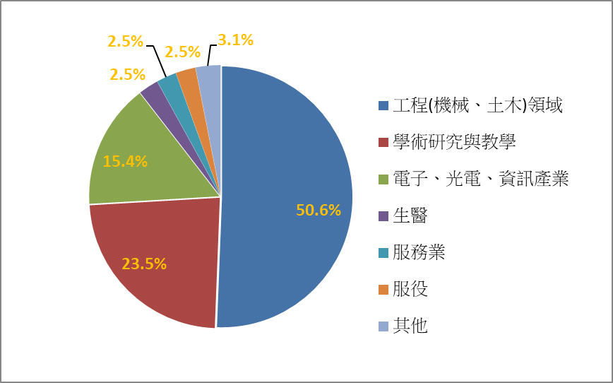 圖為106年度本所辦理工程教育認證畢業生問卷調查162份有效問卷的就業領域分布狀況統計結果,包括53位博士(33%)及109位碩士(67%)。畢業生15年以上校友有35人(22%),畢業生10-15年校友有27人(17%),畢業生5-10年的有41人(25%),畢業生3-5年的有22人(13%),畢業生3年內的則有37人(23%),分配堪稱均衡。可看出應力所畢業生就業領域,大多數仍在工程(機械、土木)領域、學術研究教學領域、電子光電資訊產業等三大領域,此三者的總比例約佔近9成。